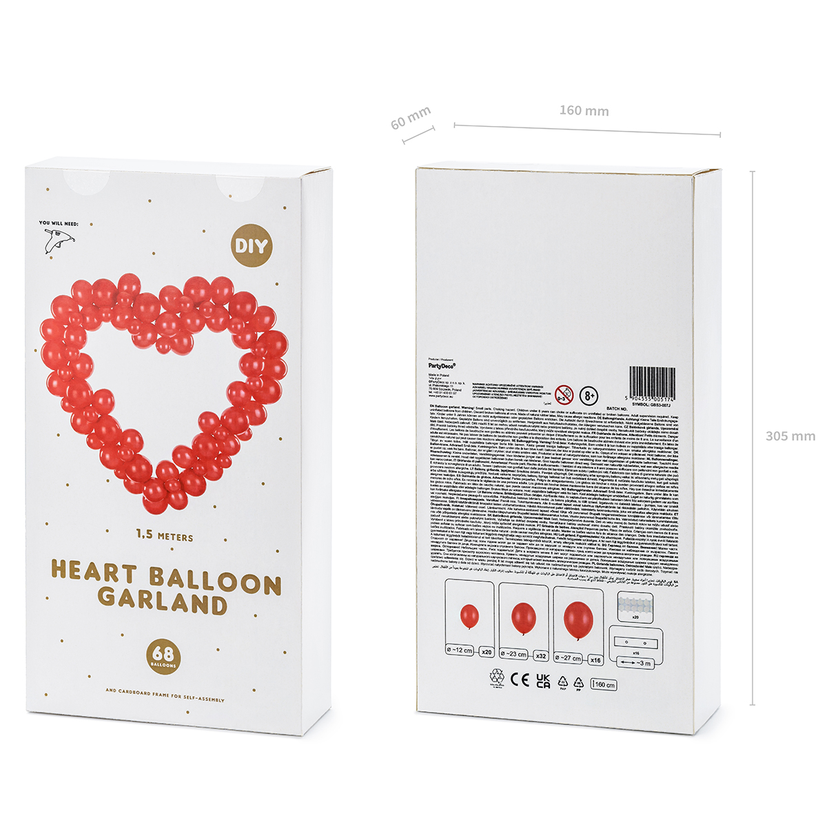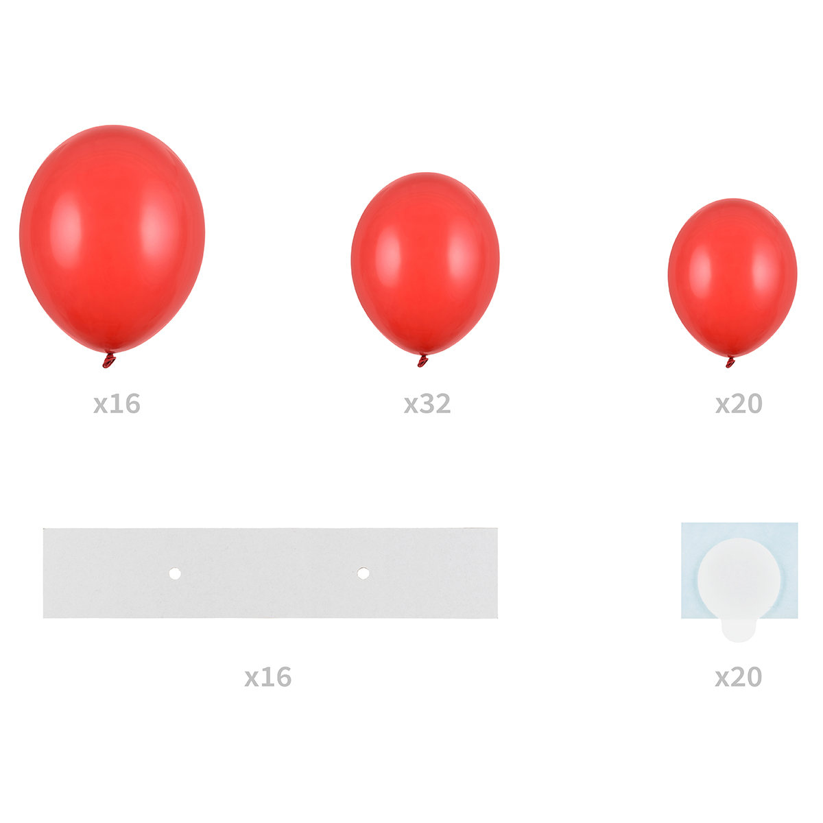 The set includes 68 red balloons, 16 cardboard elements for the frame, 20 pieces of double-sided adhesive stickers, instructions.