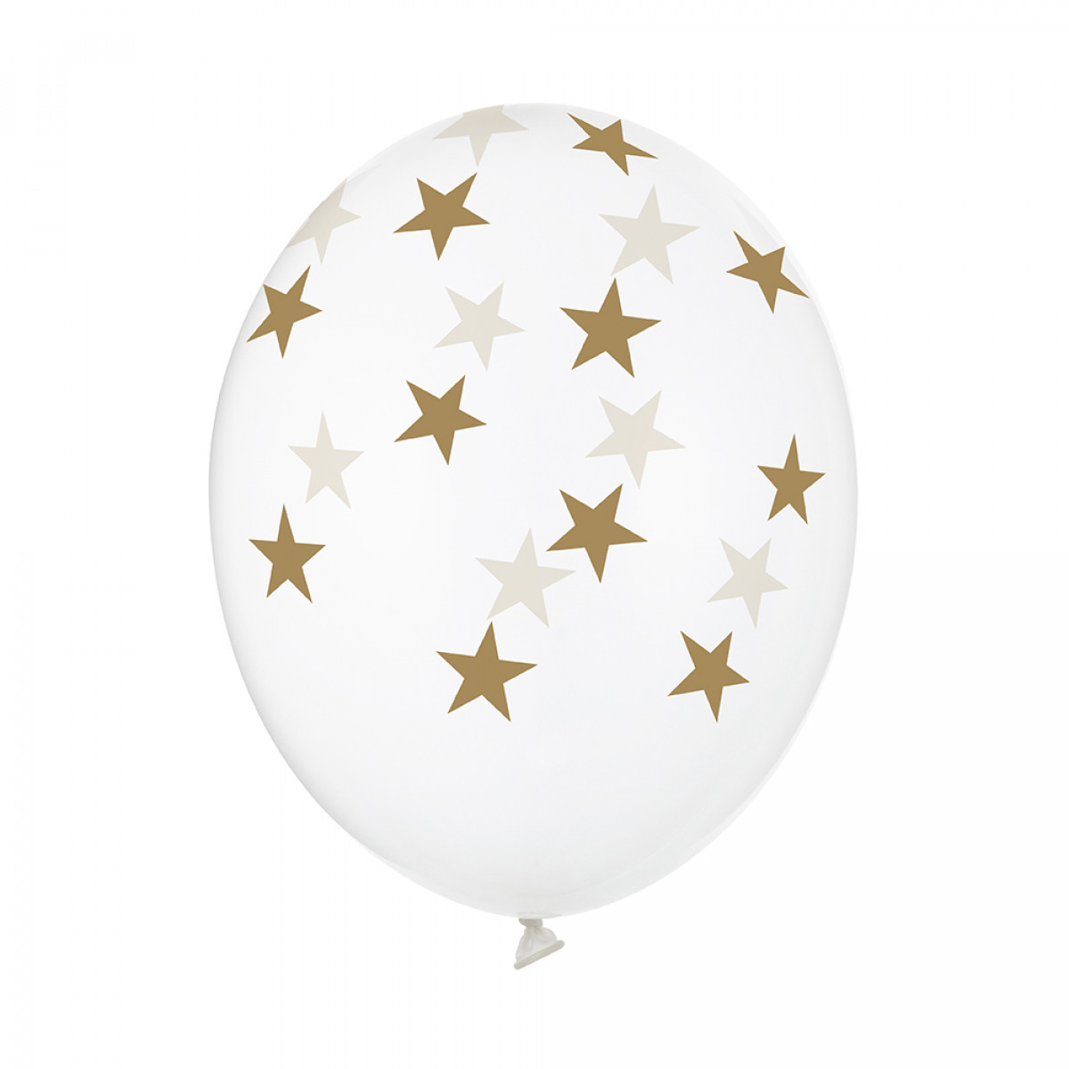 Strong, transparent balloons with golden stars - a charming accent to a gift and a great decoration for a celebration.