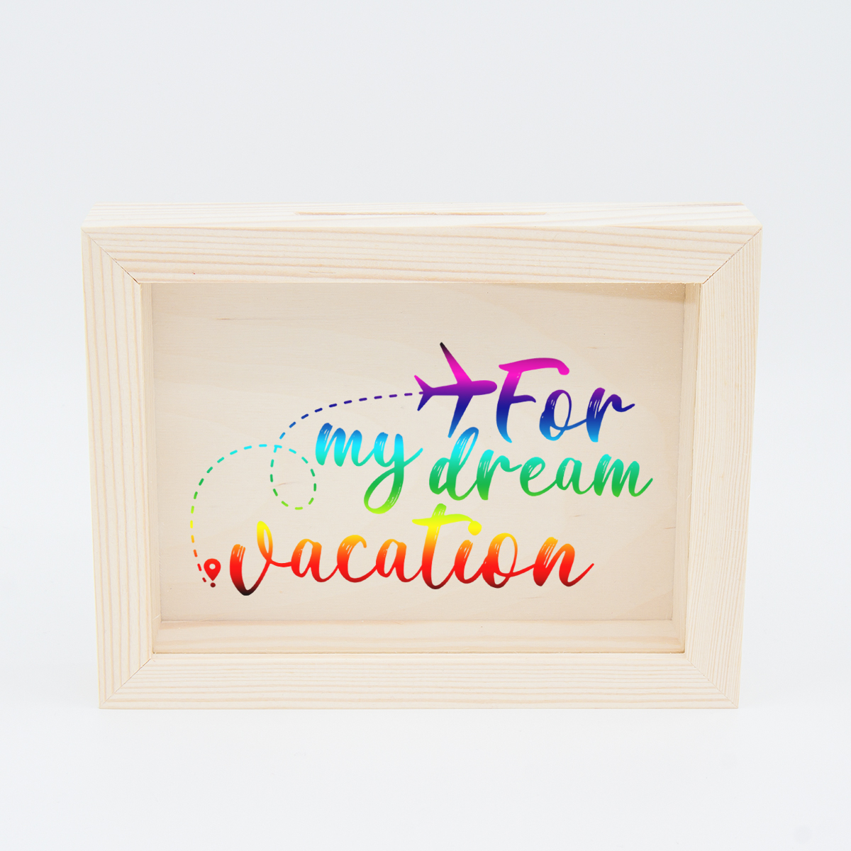Exclusive "Vacation fund" frame-saver with bold text on the outside. This is an original saver and a great gift!