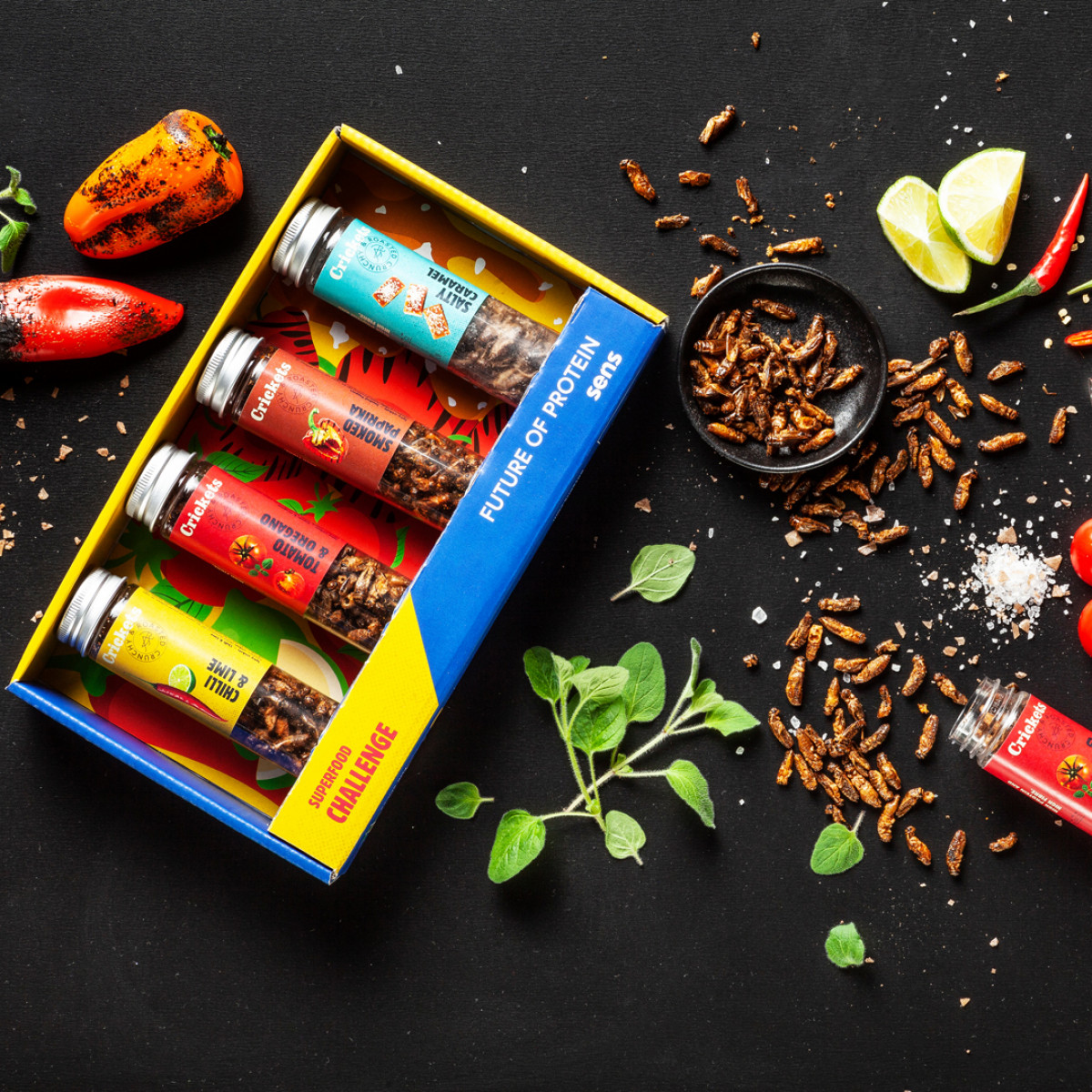 Practical transparent tubes in which the crickets are packed help everyone join this unique experience. Finished? Reuse the tubes as spice jars.