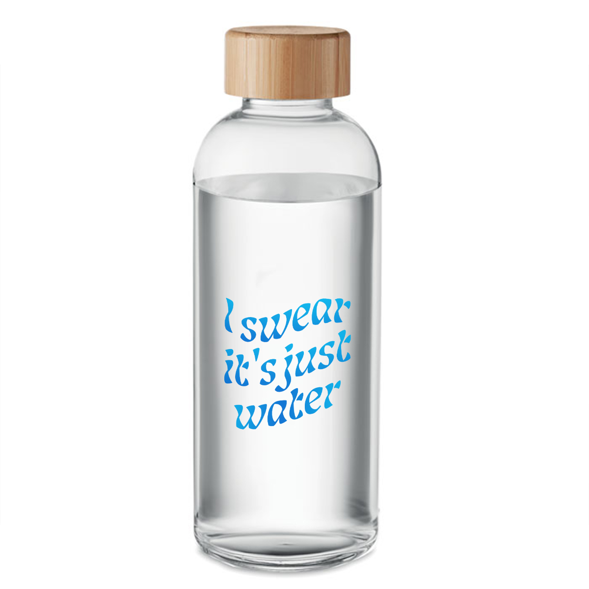 Glass Water Bottle "I swear it's just water" – a convenient and eco-friendly choice for everyday use. Perfect for work, sports, travel, or at home, it’s designed to be your reliable daily companion, while the playful text adds a touch of humour and originality.