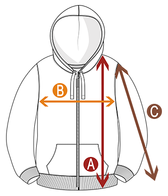 Size* | Length (A) | Chest (B) | Sleeve (C) |