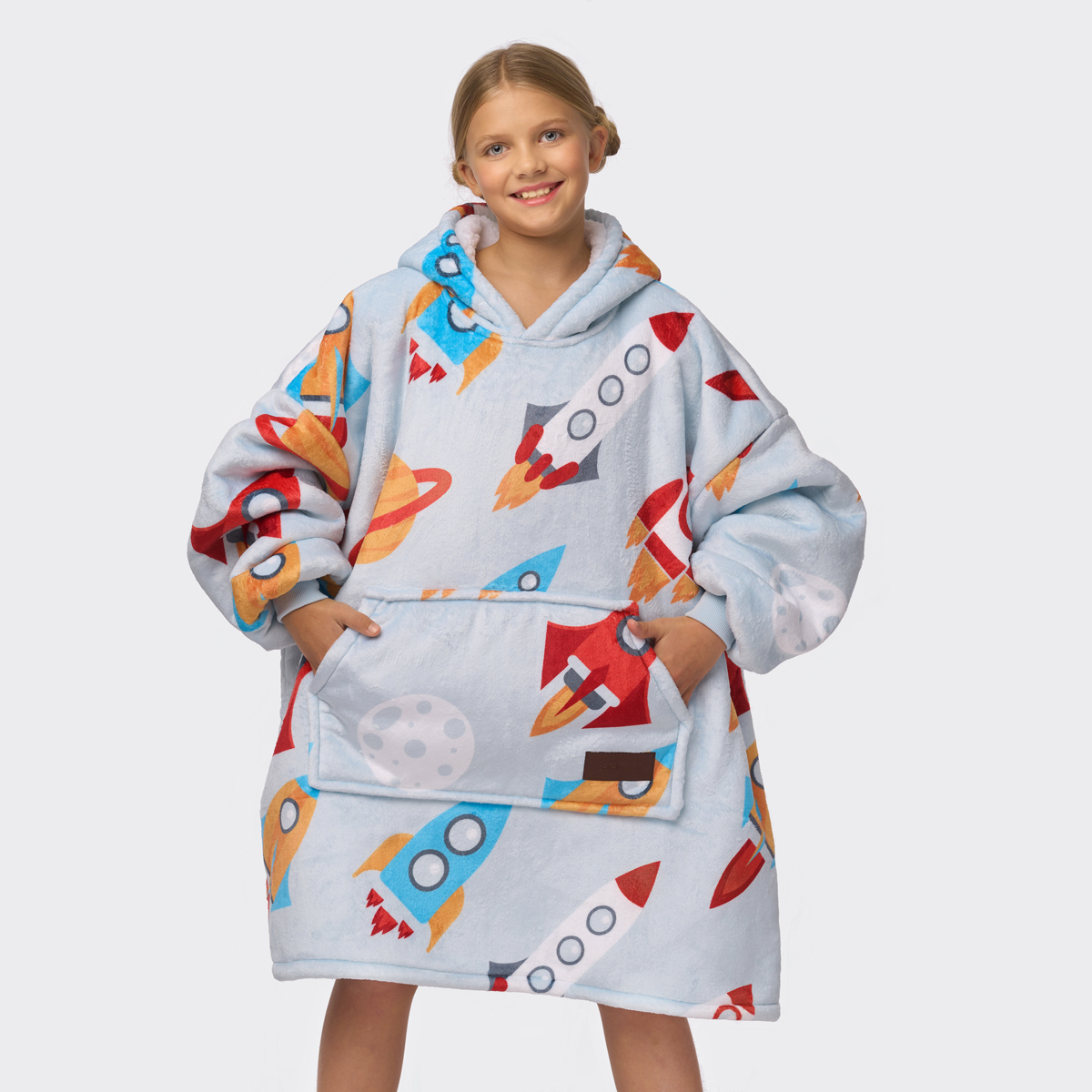 Feel charming and cozy, dressed in the brand "BARAMOOR" sweatshirt - blanket! It is the warmest and coziest, oversized sweatshirt designed to provide maximum comfort and freedom of movement while ensuring you are always warm, whether lying on the sofa, moving around the house, or actively spending time outdoors or in the city! While spending time at home, you will feel like you are wrapped in a large, warm, soft blanket, and when you wear it in the city - you will surely stand out from the crowd! Kids' BARAMOOR Sweatshirt - Blanket "Rockets" - a gift idea that will delight every child, especially those who dream of becoming astronauts.
