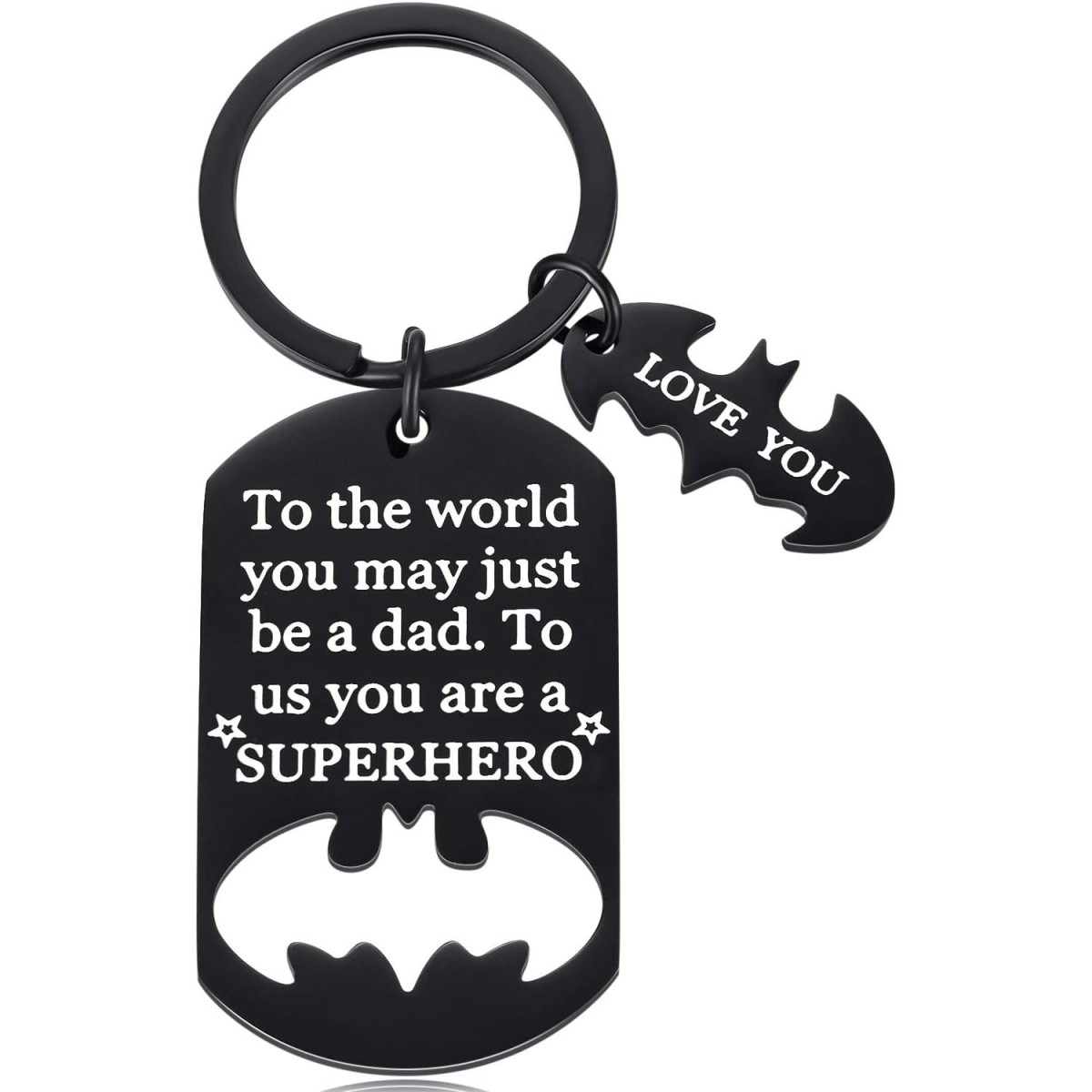 Black metal keychain. The keychain is engraved with the inscription "To the world you may just be a dad. To us you are a SUPERHERO. LOVE YOU".