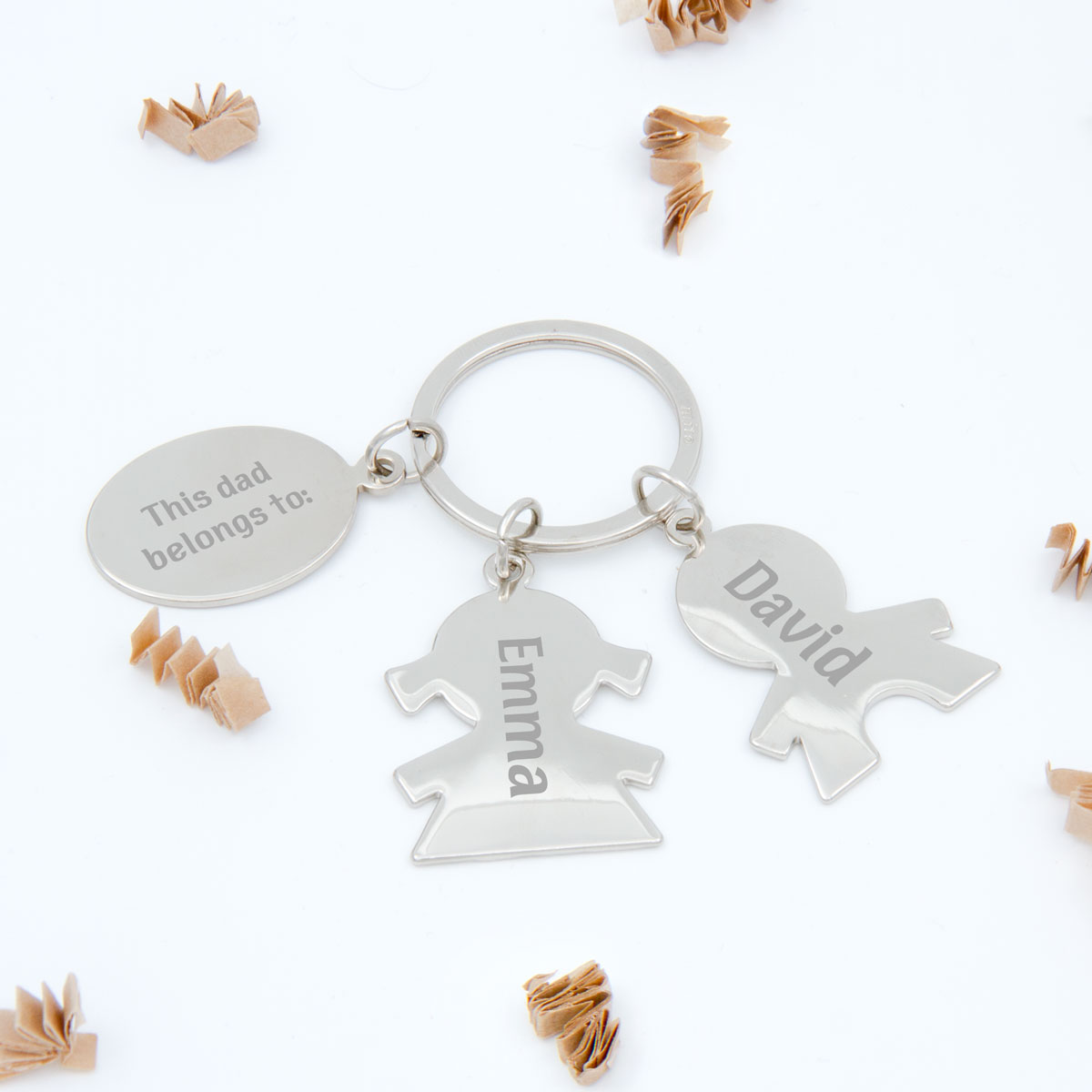 Silver-colored keychain with engraved text: "This Dad Belongs to:" with chosen boys' or girls' names - a unique gift that will delight every dad.