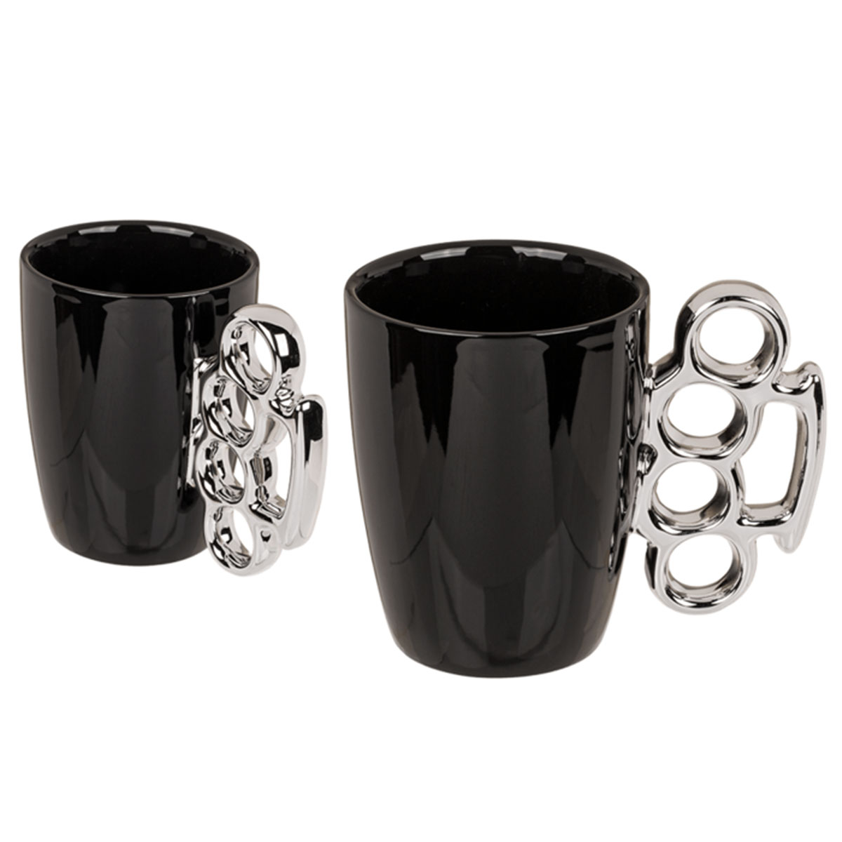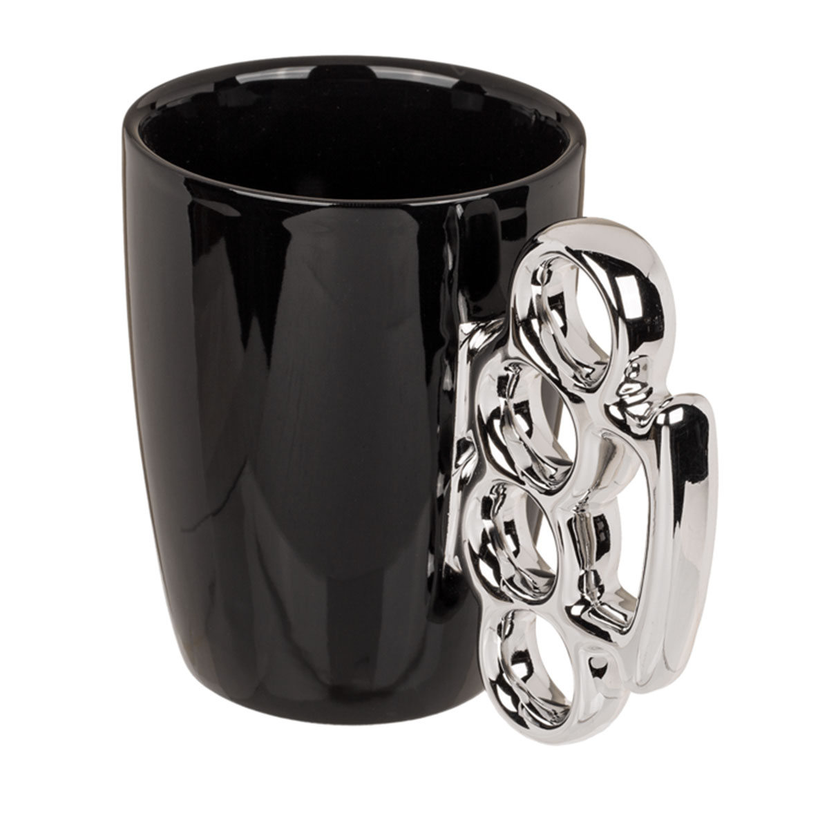 A large mug with a shiny knuckle-shaped handle! Be sure that no one will dare to drink your coffee.