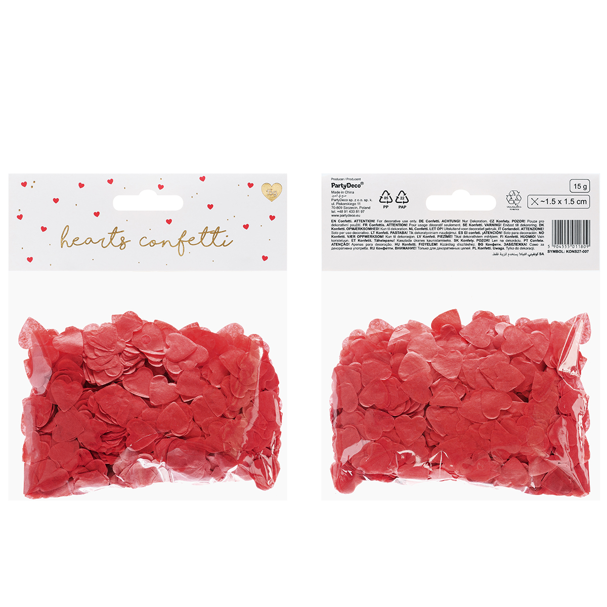 Heart confetti is usually used as decoration, for example, on the table or as a decorative element at cocktail parties or other events. Hearts can also be used as small gifts or messages, for example, placed in letters or cards. Paper red heart confetti is often sold in large quantities to be used as mass decoration.