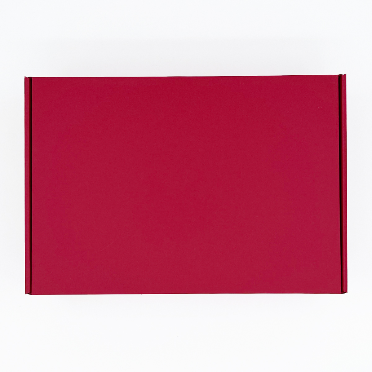 A high-quality box made of sturdy decorative corrugated cardboard. Both the inside and outside of the box are dark red.