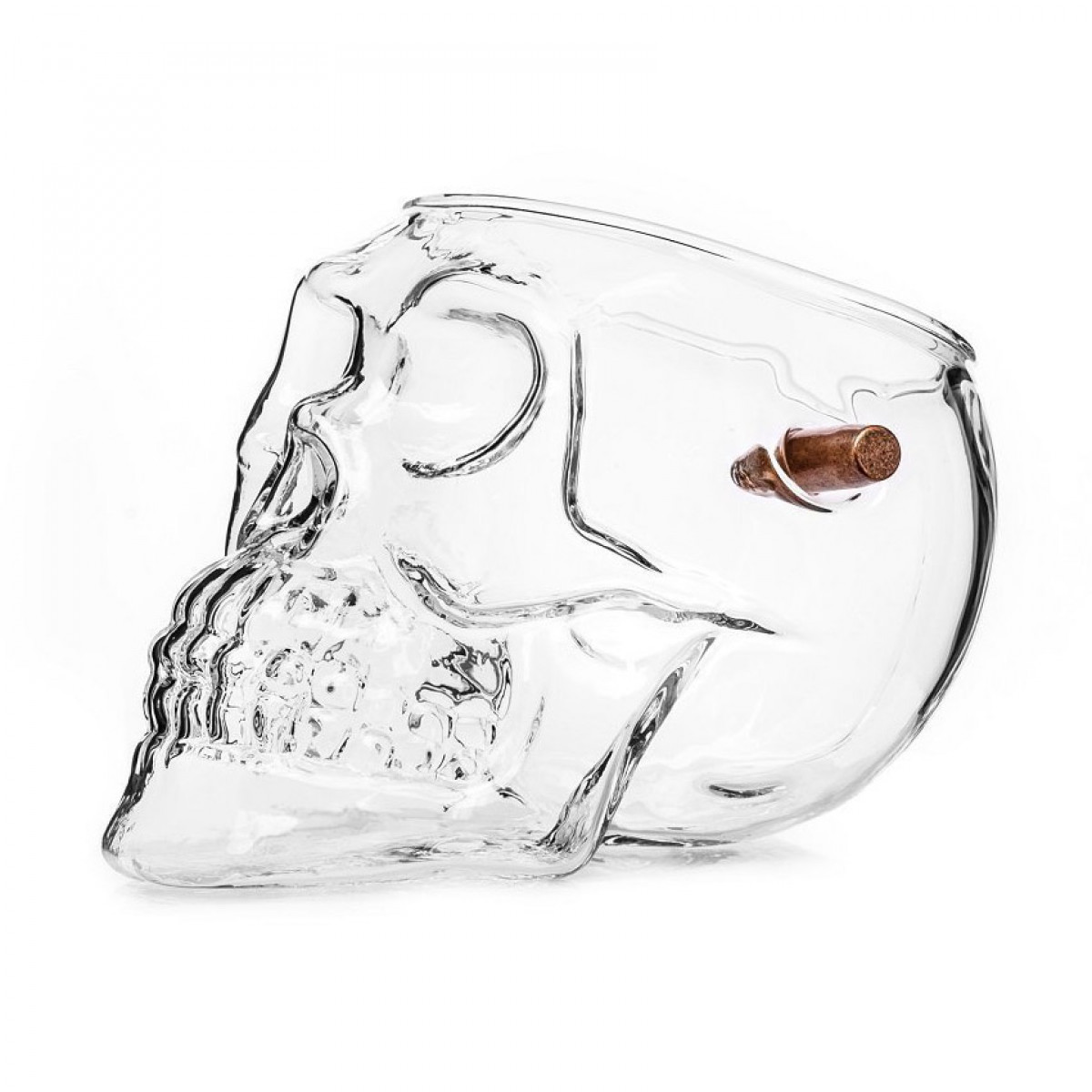 This is an exceptionally unique and original design hand-blown skull-shaped glass with a real bullet stuck inside.