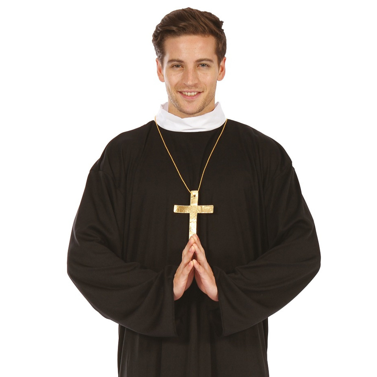 The costume features a long black cassock with a distinctive white collar insert, giving it a realistic priestly look.