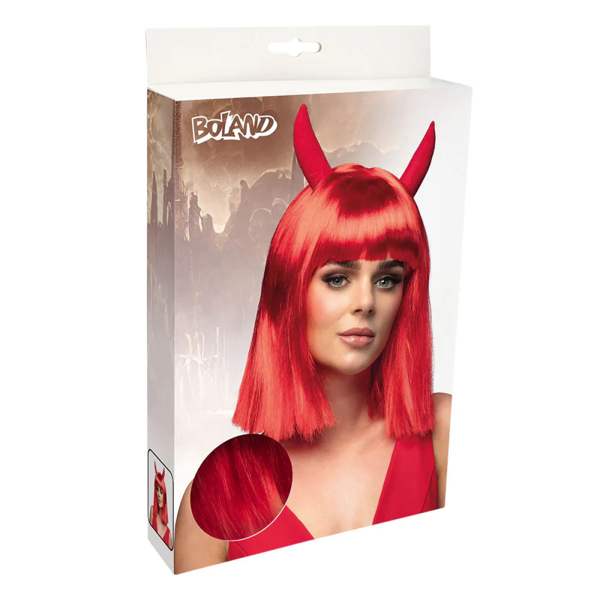 Want to stand out from the crowd at a party? This high-quality and exclusive wig will definitely help create an unforgettable festive look! The wig is long with bangs and has red devil horns. A perfect hairstyle that will look great at a scary Halloween party.