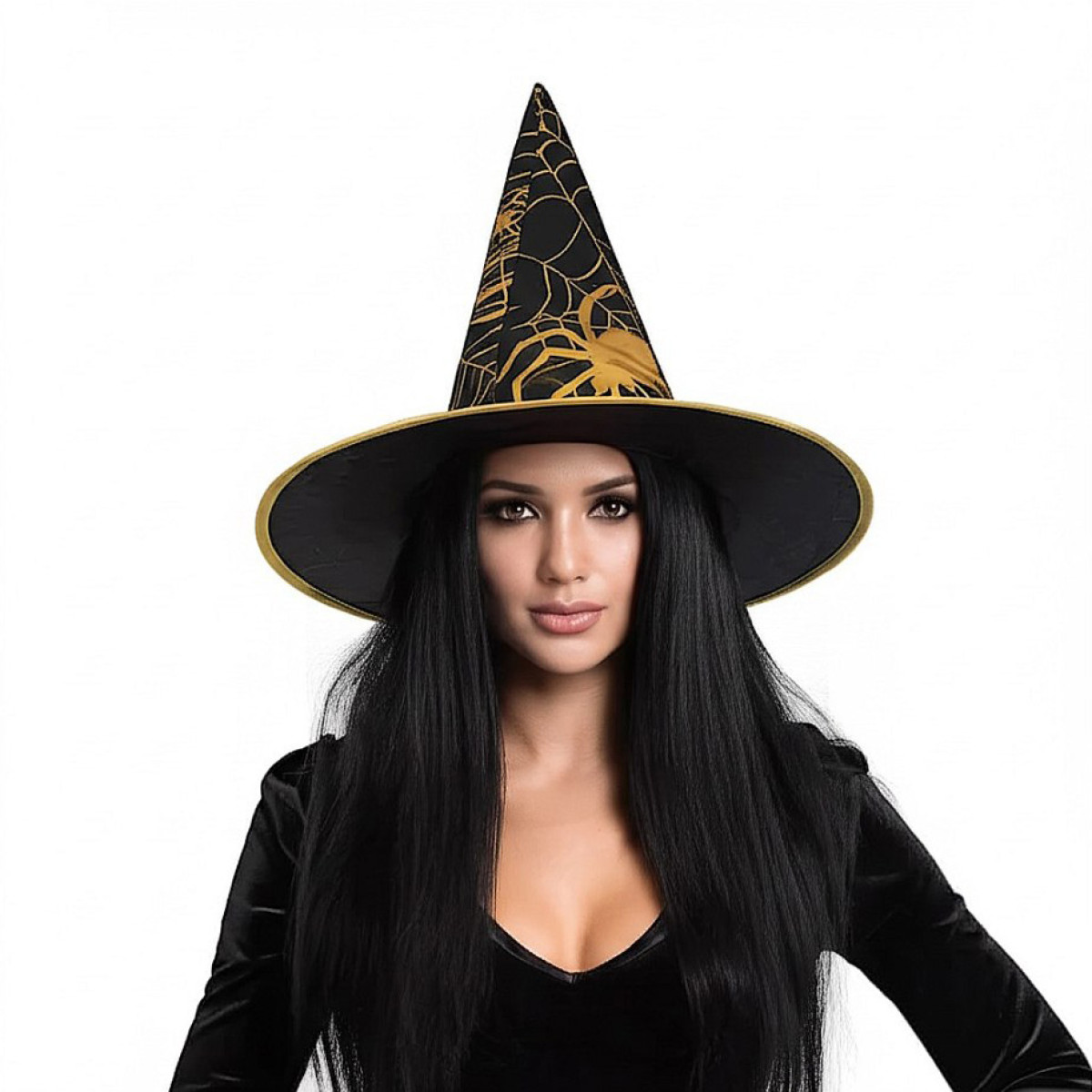 The witch's hat is an indispensable accessory for Halloween, carnival or a themed party. The black, pointed hat is decorated with golden spider webs and a spider, giving the look a unique and mystical feel.