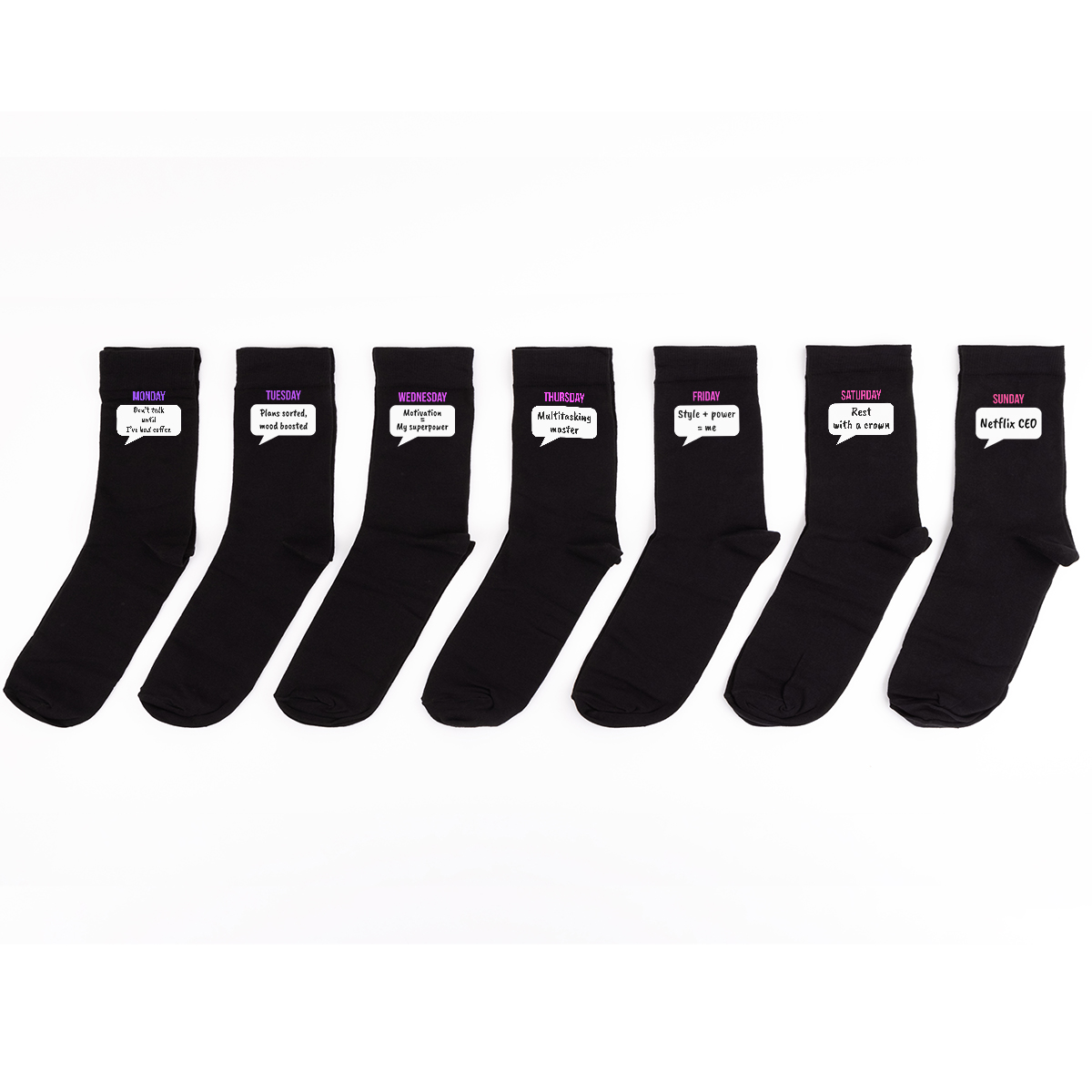 - 7 pairs of socks with a print on each sock (7 different layouts x 2 pieces).